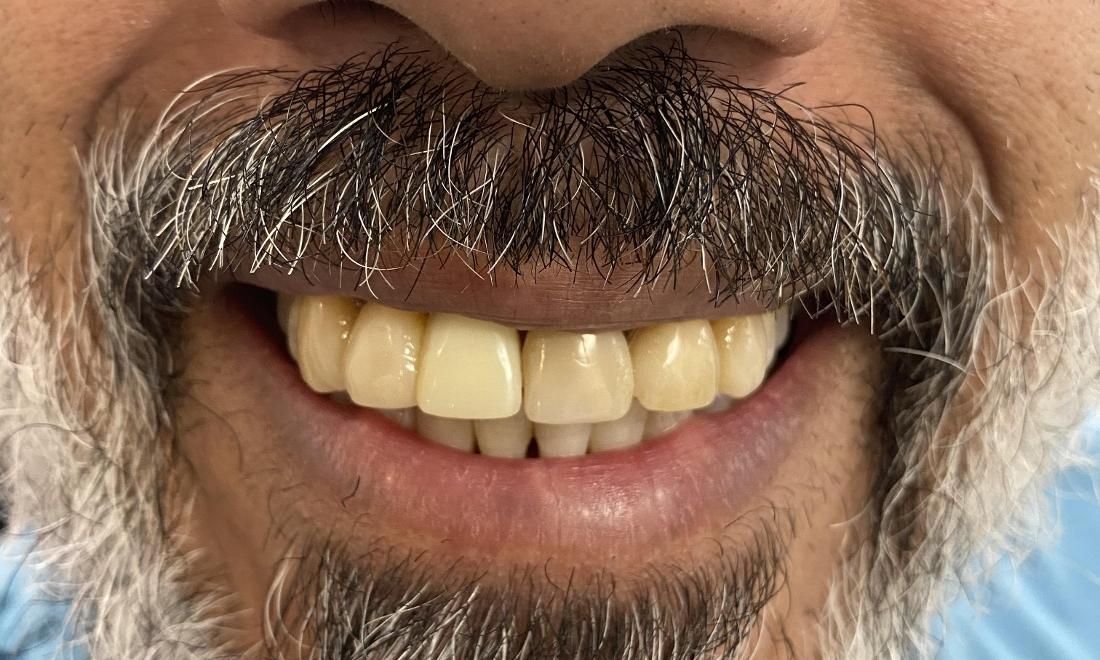 On second visit a combination of porcelain veneers and crowns have been cemented on upper and lower arches in this case